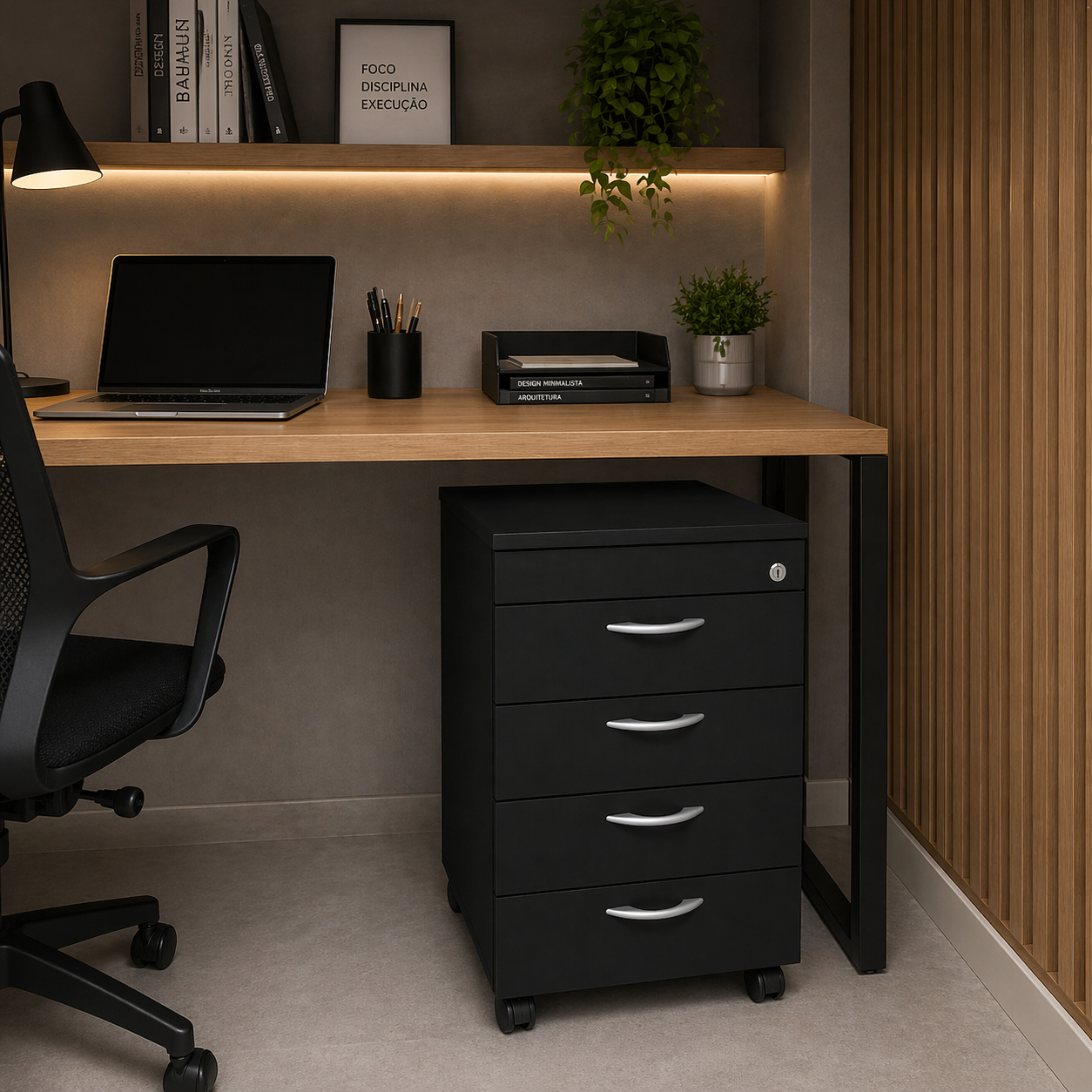 Solução: o Gaveteiro Volante Porquinho 4 Gavetas entrega um apoio móvel para o seu escritório, com rodízios, gavetas internas em aço, corrediças metálicas e chave para manter documentos e materiais sempre ao alcance, com mais controle e padrão profissional.