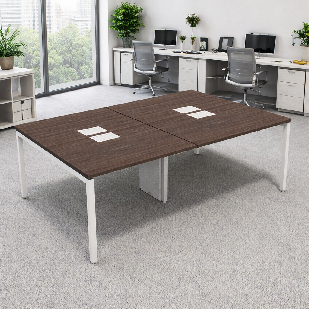 Solução: a Plataforma de Trabalho 4 lugares entrega previsibilidade de layout com espaço definido por usuário, calha central para fiação oculta e 1 caixa de tomada por pessoa (energia e dados no ponto certo). O conjunto combina tampo bipartido em MDP 25 mm e estrutura em aço carbono com pés niveladores, criando uma estação consistente para escritório e coworking.